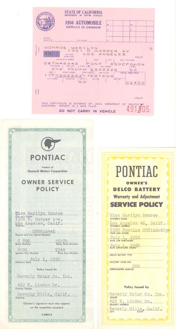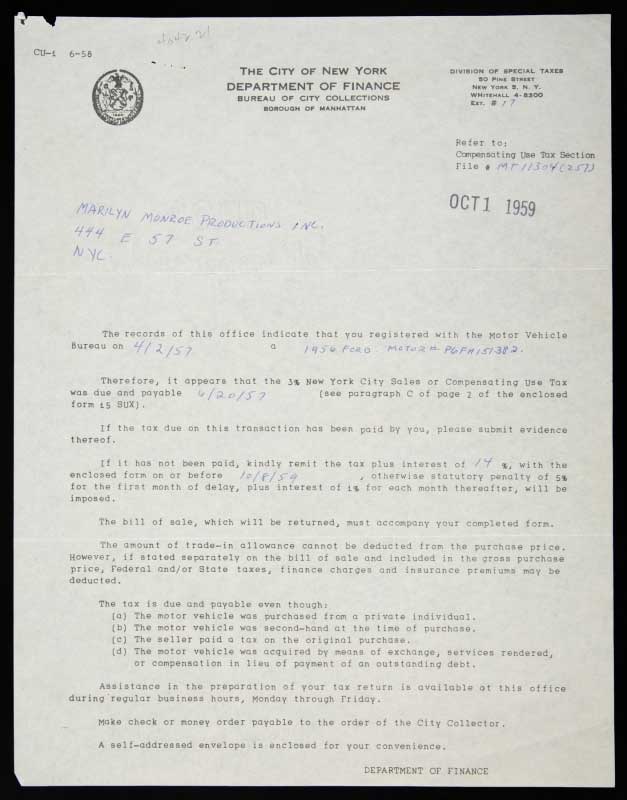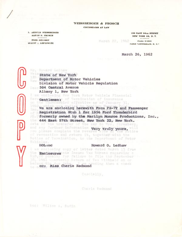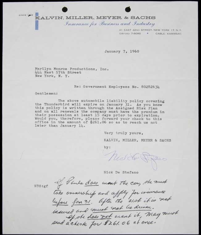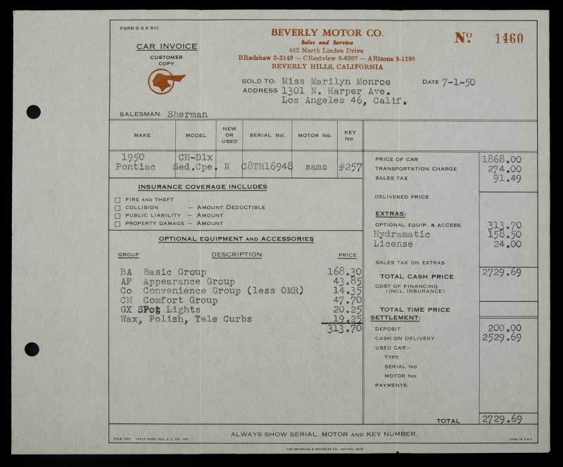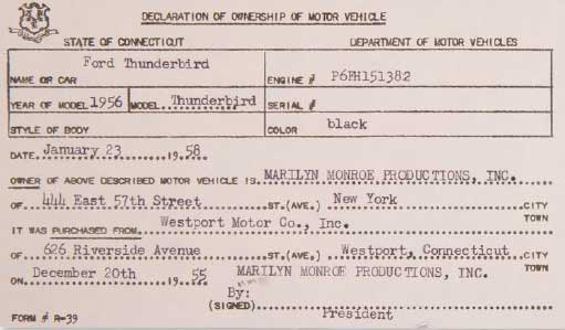 Purchase of the Ford Thunderbird under the name of the Marilyn Monroe Productions, dated January 23, 1958