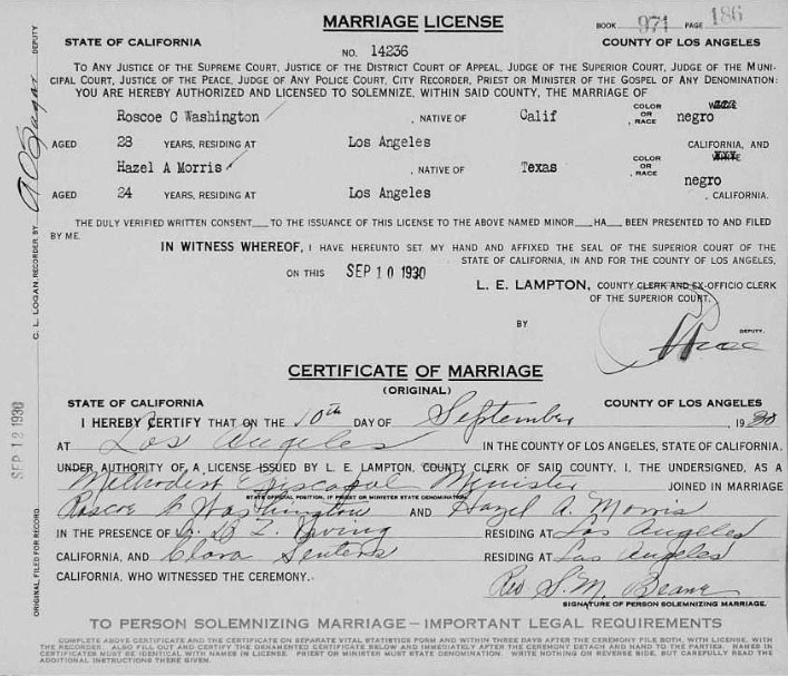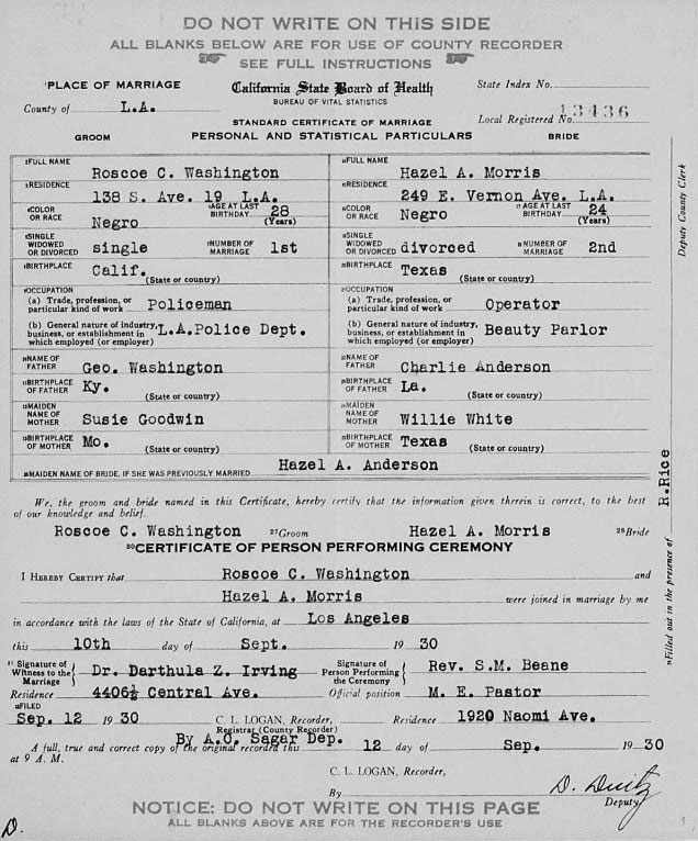Elle épousa le lieutenant du Los Angeles Police Department, Roscoe "Rocky" Conkling Washington