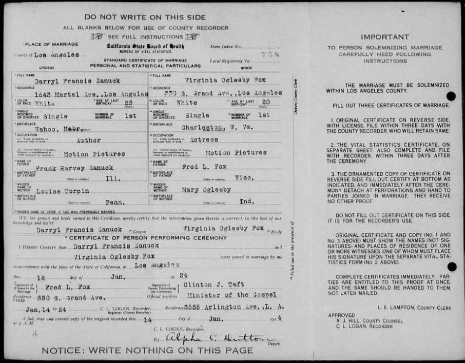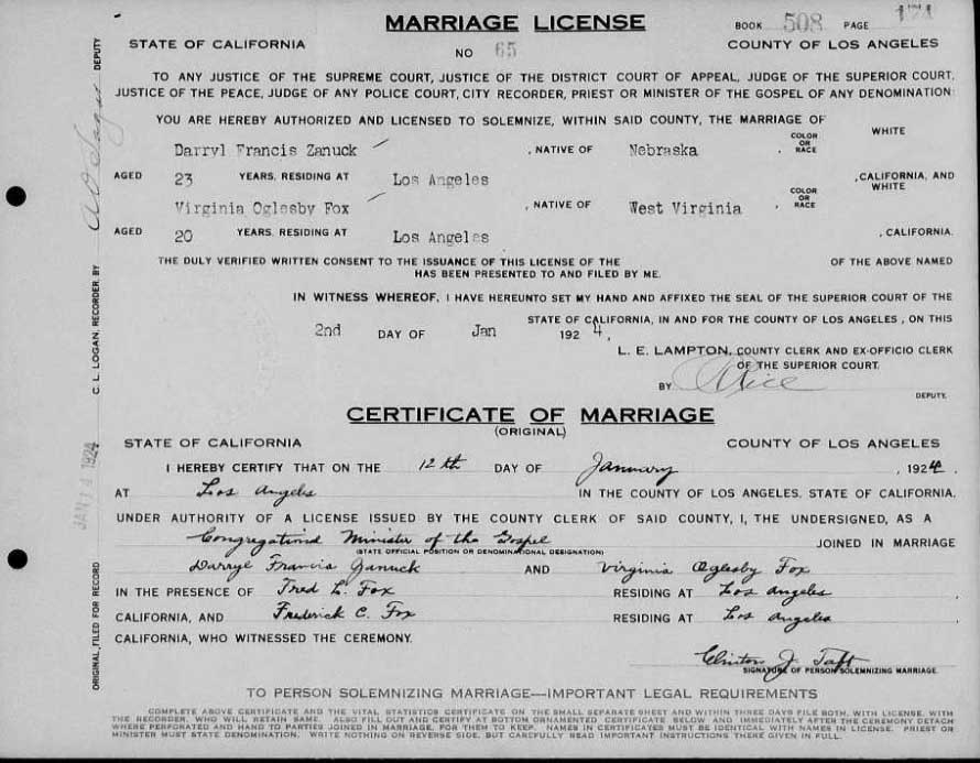 On January 12, 1924 in Los Angeles, he married Virginia Oglesby Fox (April 19, 1906, West Virginia-October